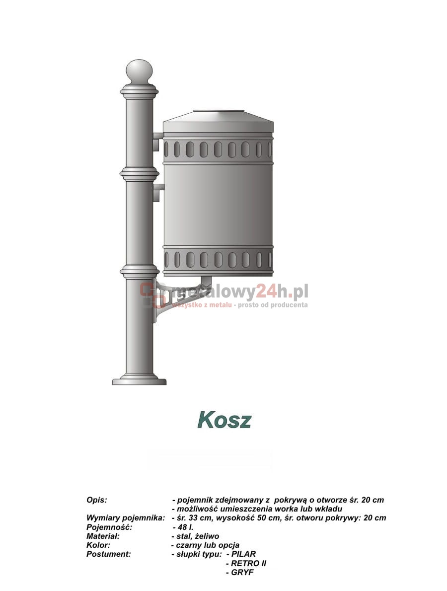 Kosz ozdobny stalowo-żeliwny - to trwały i łatwy w montażu kosz ozdobny w stylu retro o atrakcyjnym wyglądzie doskonale nadający się do zastosowania w przestrzeniach historycznych, parkach, czy ogrodach.