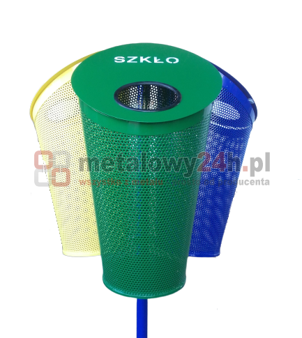 Kosze na śmieci Kozar z trzema pojemnikami. Pojemniki są wykonane z blachy perforowanej. Kosze są łatwe w opróżnianiu, wystarczy zdjąć pojemniki. Kosze pomalowane proszkowo - możliwość wyboru koloru z palety RAL.