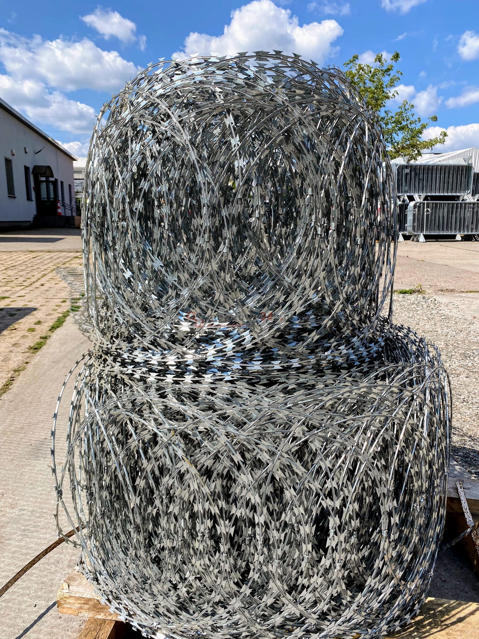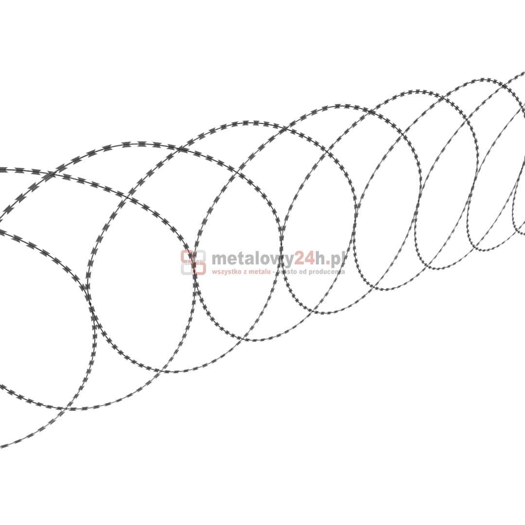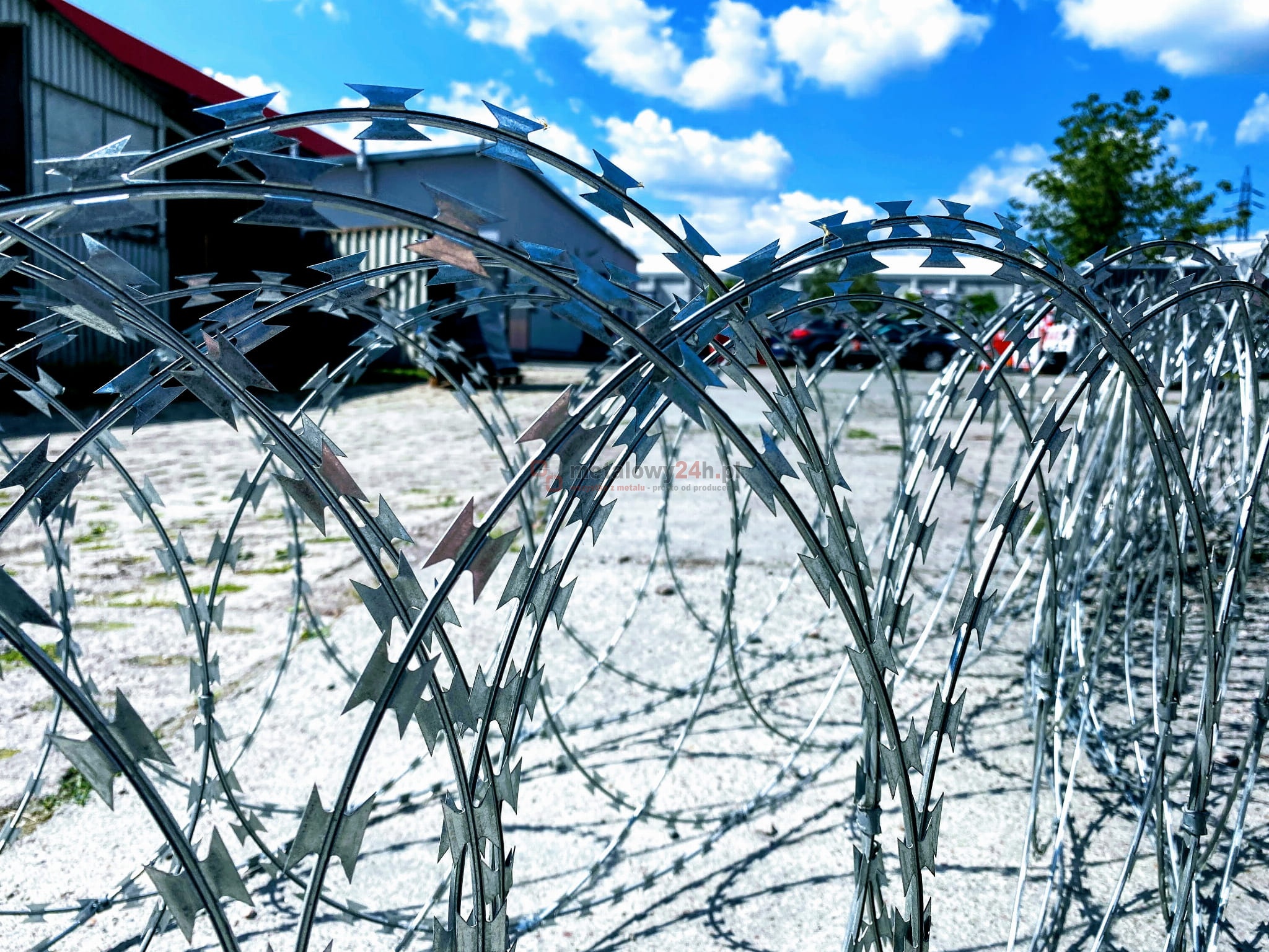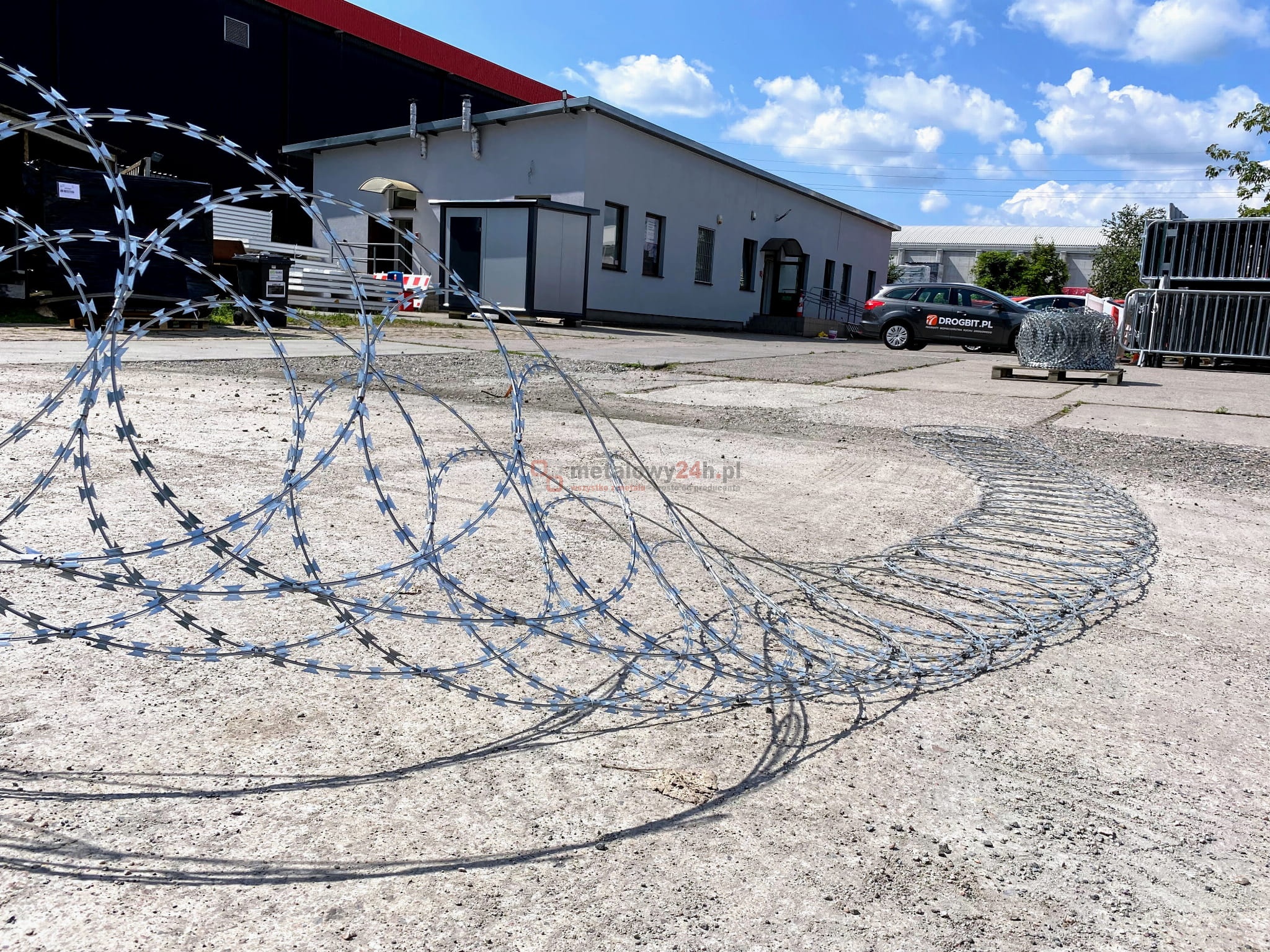 Zasieki płaskie z drutu ostrzowego - Ø 90 cm (900 mm) - to wysokiej jakości produkt do umiarkowanie agresywnego zabezpieczania obszarów wymagających szczególnej ochrony i dozoru lub obszarów o ograniczonej dostępności (np. placówki wojskowe i policyjne, poligony, lotniska, obiekty Służby Więziennej, tereny przemysłowe). Zasieki płaskie funkcjonują jako ogrodzenie uzupełniające tradycyjnych, neutralnych form ogrodzeniowych, które są dużo łatwiejsze do sforsowania (ogrodzenie panelowe, ogrodzenia z siatki ślimakowej, ogrodzenia betonowe).